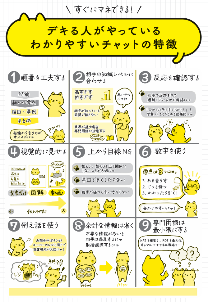 本書はネコ界を舞台に、仕事の効率化を図るための具体的なテクニックを100の図解と共に解説してくれているからだ。